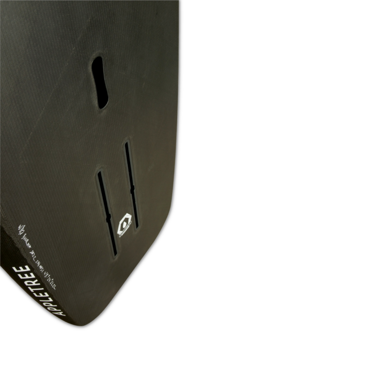 Elongated Planing Surface- The bottom has a longer flat section around the foil connection area. This increase glide efficiency and improves low wind handling. The abrupt tail helps with release when getting back on foil after landing jumps.